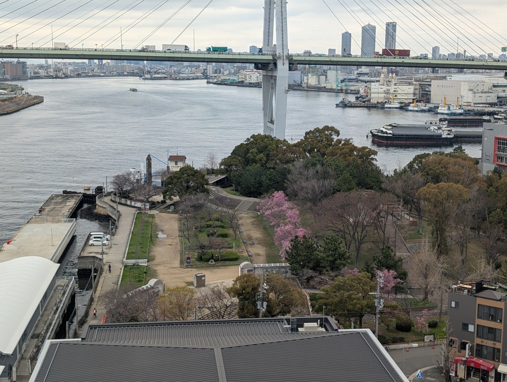 Edasi läksime Osaka akvaariumisse, aga seal oli veel pikem järjekord kui Osaka lossi juures. Üritasime jälle veebist pileteid osta, aga esimeste vabade aegade piletid said kiiremini otsa kui jõudsime “osta” nuppu vajutada. Lõpuks saime piletid, mis võimaldasid meil akvaarium külastada alles kahe tunni pärast. Aja parajaks tegemiseks sõitsime seal samas asuva Tempozani vaaterattaga. Kuna piletikassas järjekorda polnud, ostsime piletid sealt, aga vaaterattale saamiseks oli lausa kaks järjekorda. Tavakabiini järjekord oli sisuliselt olematu, aga läbipaistva põhjaga versiooni ooteaeg oli 15 minutit. Otsustasime viimase kasuks, sest see tundus ägedam. Peagi saime aru, et läbipaistva põhjaga kabiine on umbes 20% ja sellest ka pikk ootamine – vahepeal jäid mitmed tavakabiinid tühjaks, sest keegi ei soovinud nendesse minna. Kui saime lõpuks kabiini, selgus, et põhi oli vaevu läbi paistev – see oli väga paks pleksiklaas ja läbi nägi väga uduselt. Seega ei olnud ootamine ennast väärt. Vaateratas ise on 112.5m kõrgune väga äge metallkonstruktsioon. Öösel peaks see olema valgustatud vastavalt ilmaennustusele (sinine = selge, roheline = pilvine, punane = vihm), kuid seda me ei näinud. Vaated olid kenad, kuigi ilm oli pilvine ning kirkaid pilte ei õnnestunud teha. Kõrgelt nägime, et läheduses asub üks natuke roosakamate kirsipuudega park. Pärast vaateratast seadsimegi sammud sinna, sest aega oli ikka liiga palju üle. Pargis olid õied palju kaunimad, kui Osaka lossi juures, kuigi ka siin ei olnud tippaeg käes.