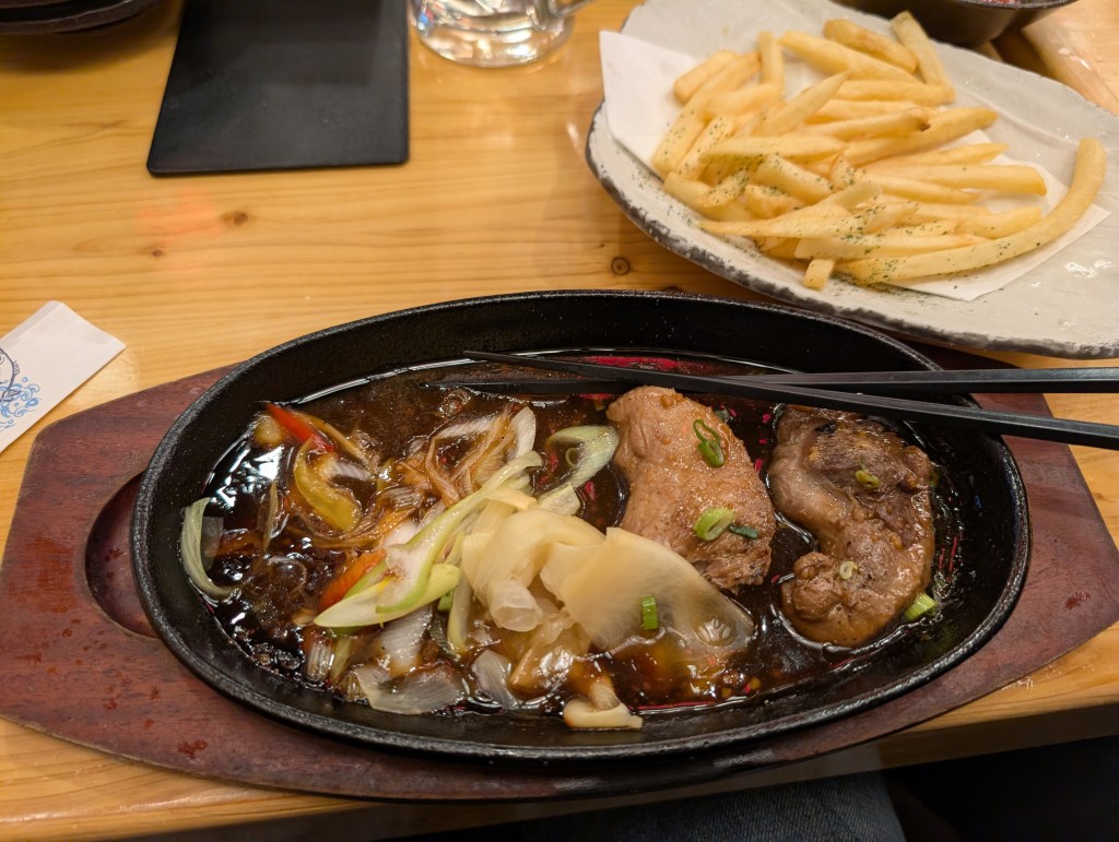 Tundus, et tegu oli mingi baari moodi asutusega, sest menüüs oli suur rõhk erinevatel alkohoolsetel jookidel. Lisaks oli neil toidumenüü, mis keskendus peamiselt kalale. Seda, kas tegu oli jaapani või hiina restoraniga, ma lõpuks aru ei saanudki – viiteid oli seal mõlemale. Tellimine käis jällegi põneval viisil – teenindaja tõi meile mingi paberilehe QR koodiga. Seda skanneerides avanes veebileht menüüga, kust saime oma toidud ostukorvi lisada ja tellimuse välja saata. Varsti pärast seda hakkasid teenindajad meie toite lauda tooma. Tundus, et nende köök asus 2. korrusel, sest leti taga oli toidulift, kus road järjest välja tulid.